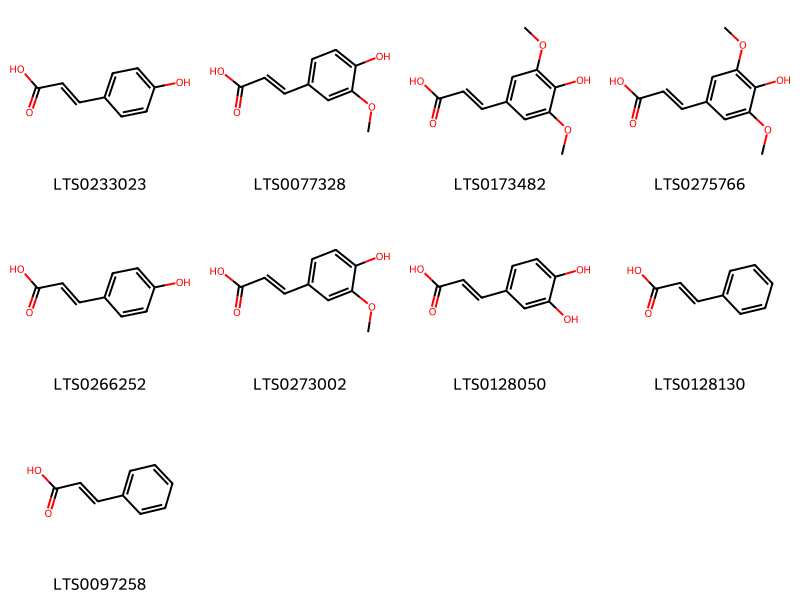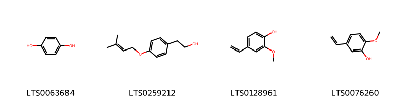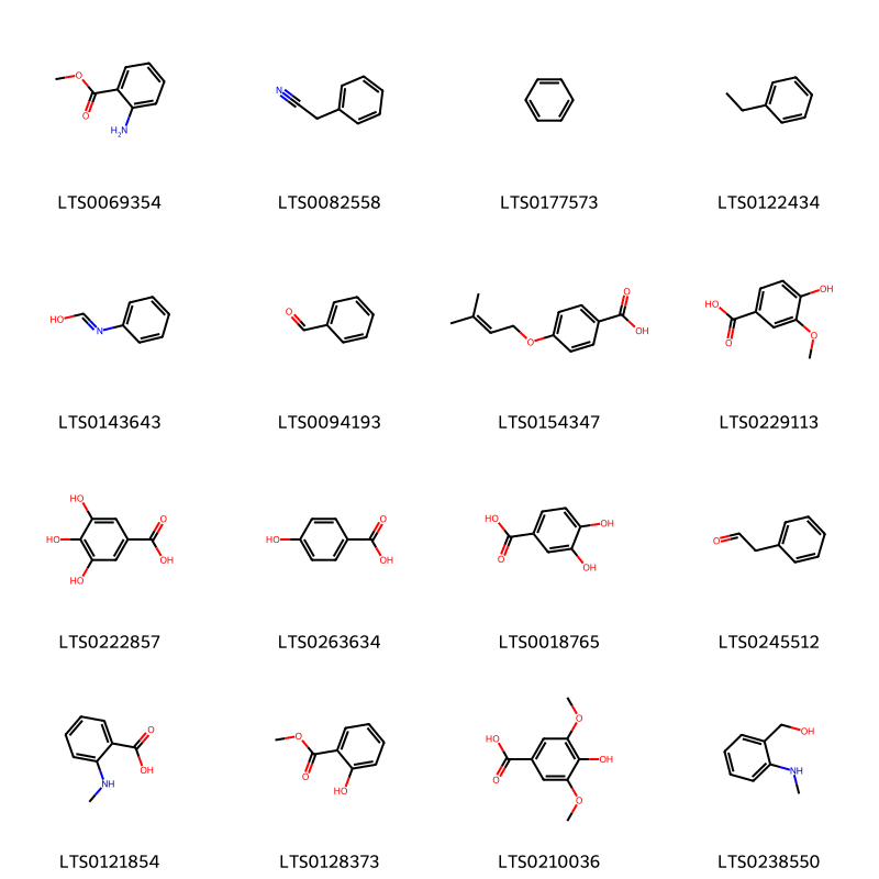 Cấu trúc hóa học của các hoạt chất thuộc nhóm Benzene and substituted derivatives là methyl anthranilate (LTS0069354), phenylacetonitrile (LTS0082558), benzene (LTS0177573), ethylbenzene (LTS0122434), n-phenylcarboximidic acid (LTS0143643), benzaldehyde (LTS0094193), 4-[(3-methylbut-2-en-1-yl)oxy]benzoic acid (LTS0154347), vanillic acid (LTS0229113), galop (LTS0222857), p-hydroxybenzoic acid (LTS0263634), 3,4-dihydroxybenzoic acid (LTS0018765), phenylacetaldehyde (LTS0245512), n-methylanthranilic acid (LTS0121854), methyl salicylate (LTS0128373), syringic acid (LTS0210036), [2-(methylamino)phenyl]methanol (LTS0238550).