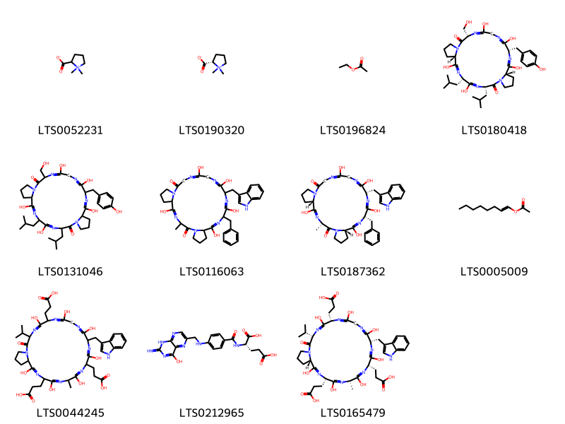 Cấu trúc hóa học của các hoạt chất thuộc nhóm Carboxylic acids and derivatives là 1,1-dimethylpyrrolidin-1-ium-2-carboxylate (LTS0052231), stachydrine (LTS0190320), ethyl acetate (LTS0196824), (3s,6s,9s,15s,21s,24s)-5,8,17,20,23-pentahydroxy-15-(hydroxymethyl)-21-[(4-hydroxyphenyl)methyl]-3,6-bis(2-methylpropyl)-1,4,7,13,16,19,22-heptaazatricyclo[22.3.0.0⁹,¹³]heptacosa-4,7,16,19,22-pentaene-2,14-dione (LTS0180418), 5,8,17,20,23-pentahydroxy-15-(hydroxymethyl)-21-[(4-hydroxyphenyl)methyl]-3,6-bis(2-methylpropyl)-1,4,7,13,16,19,22-heptaazatricyclo[22.3.0.0⁹,¹³]heptacosa-4,7,16,19,22-pentaene-2,14-dione (LTS0131046), 21-benzyl-5,14,17,20,23-pentahydroxy-18-(1h-indol-3-ylmethyl)-3-methyl-1,4,10,13,16,19,22-heptaazatricyclo[22.3.0.0⁶,¹⁰]heptacosa-4,13,16,19,22-pentaene-2,11-dione (LTS0116063), (3s,6s,18s,21s,24s)-21-benzyl-5,14,17,20,23-pentahydroxy-18-(1h-indol-3-ylmethyl)-3-methyl-1,4,10,13,16,19,22-heptaazatricyclo[22.3.0.0⁶,¹⁰]heptacosa-4,13,16,19,22-pentaene-2,11-dione (LTS0187362), oct-1-en-1-yl acetate (LTS0005009), 3-[9,18-bis(2-carboxyethyl)-1,4,7,10,13,16,19-heptahydroxy-12-(1h-indol-3-ylmethyl)-21-isopropyl-6-methyl-22-oxo-3h,6h,9h,12h,15h,18h,21h,24h,25h,26h,26ah-pyrrolo[1,2-a]1,4,7,10,13,16,19,22-octaazacyclotetracosan-3-yl]propanoic acid (LTS0044245), acid, folic (LTS0212965), 3-[(3s,6s,9s,12s,18s,21s,26as)-3,9-bis(2-carboxyethyl)-1,4,7,10,13,16,19-heptahydroxy-12-(1h-indol-3-ylmethyl)-21-isopropyl-6-methyl-22-oxo-3h,6h,9h,12h,15h,18h,21h,24h,25h,26h,26ah-pyrrolo[1,2-a]1,4,7,10,13,16,19,22-octaazacyclotetracosan-18-yl]propanoic acid (LTS0165479).
