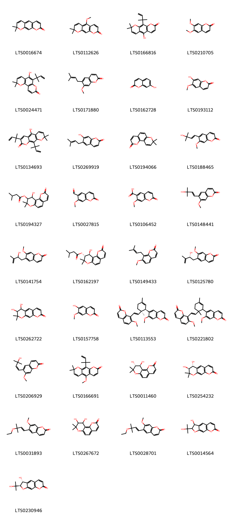 Cấu trúc hóa học của các hoạt chất thuộc nhóm Coumarins and derivatives là xanthyletin (LTS0016674), xanthoxyletin (LTS0112626), nor-dentatin (LTS0166816), scoparone (LTS0210705), 5-hydroxy-2,2-dimethyl-6-(2-methylbut-3-en-2-yl)pyrano[2,3-h]chromen-8-one (LTS0024471), suberosin (LTS0171880), umbelliferone (LTS0162728), scopoletin (LTS0193112), 5-hydroxy-8,8-dimethyl-3,10-bis(2-methylbut-3-en-2-yl)pyrano[3,2-g]chromen-2-one (LTS0134693), demethylsuberosin (LTS0269919), seselin (LTS0194066), 6-[(1e)-3-hydroxy-3-methylbut-1-en-1-yl]-7-methoxychromen-2-one (LTS0188465), 10-hydroxy-8,8-dimethyl-2-oxo-9h,10h-pyrano[2,3-h]chromen-9-yl 3-methylbutanoate (LTS0194327), 7-methoxy-2-oxochromene-6-carbaldehyde (LTS0027815), 7-methoxy-2-oxochromene-6-carboxylic acid (LTS0106452), 6-(3-hydroxy-3-methylbut-1-en-1-yl)-7-methoxychromen-2-one (LTS0148441), 6-(2-hydroxy-3-methylbut-3-en-1-yl)-7-methoxychromen-2-one (LTS0141754), (9r,10s)-10-hydroxy-8,8-dimethyl-2-oxo-9h,10h-pyrano[2,3-h]chromen-9-yl 3-methylbutanoate (LTS0162197), osthole (LTS0149433), 6-[(2r)-2-hydroxy-3-methylbut-3-en-1-yl]-7-methoxychromen-2-one (LTS0125780), 6,7-dihydroxy-8,8-dimethyl-6h,7h-pyrano[3,2-g]chromen-2-one (LTS0262722), isoscopoletin (LTS0157758), 7-methoxy-6-[(1r,6r)-6-[(1e)-2-(7-methoxy-2-oxochromen-8-yl)ethenyl]-3,6-dimethylcyclohex-2-en-1-yl]chromen-2-one (LTS0113553), 7-methoxy-6-{6-[2-(7-methoxy-2-oxochromen-8-yl)ethenyl]-3,6-dimethylcyclohex-2-en-1-yl}chromen-2-one (LTS0221802), 6-[(1z)-3-hydroxy-3-methylbut-1-en-1-yl]-7-methoxychromen-2-one (LTS0206929), dentatin (LTS0166691), (9r,10s)-9,10-dihydroxy-8,8-dimethyl-9h,10h-pyrano[2,3-h]chromen-2-one (LTS0011460), (6r,7s)-6,7-dihydroxy-8,8-dimethyl-6h,7h-pyrano[3,2-g]chromen-2-one (LTS0254232), 6-(3-ethoxy-3-methylbut-1-en-1-yl)-7-methoxychromen-2-one (LTS0031893), 9,10-dihydroxy-8,8-dimethyl-9h,10h-pyrano[2,3-h]chromen-2-one (LTS0267672), 6-[(1e)-3-ethoxy-3-methylbut-1-en-1-yl]-7-methoxychromen-2-one (LTS0028701), 3-hydroxy-2-(2-hydroxypropan-2-yl)-2h,3h-furo[3,2-g]chromen-7-one (LTS0014564), (2r,3r)-3-hydroxy-2-(2-hydroxypropan-2-yl)-2h,3h-furo[3,2-g]chromen-7-one (LTS0230946).