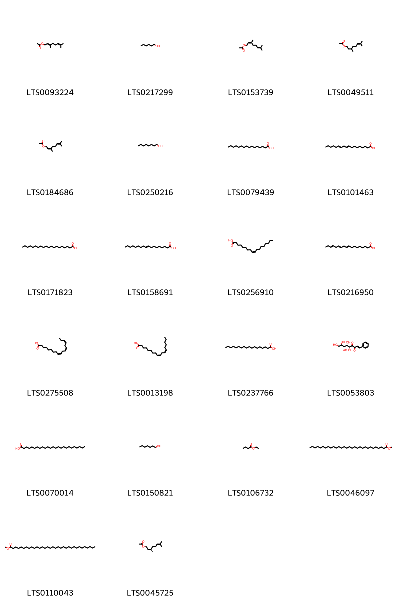 Cấu trúc hóa học của các hoạt chất thuộc nhóm Fatty Acyls là geranyl acetate (LTS0093224), hexanol (LTS0217299), neryl acetate (LTS0153739), citronellyl acetate (LTS0049511), 3,7-dimethylocta-2,6-dien-1-yl acetate (LTS0184686), octanol (LTS0250216), palmitic acid (LTS0079439), 9,12-octadecadienoic acid (LTS0101463), arachidic acid (LTS0171823), 9 octadecenoic acid (LTS0158691), oleic acid (LTS0256910), octadeca-9,12,15-trienoic acid (LTS0216950), α-linolenic acid (LTS0275508), linoleic (LTS0013198), stearic acid (LTS0237766), (5r,6s,7r,8r)-5,6,7,8,9-pentahydroxy-1-phenylnon-1-ene-3,4-dione (LTS0053803), pentacosanoic acid (LTS0070014), heptanol (LTS0150821), ethyl butyrate (LTS0106732), methyl triacontanoate (LTS0046097), methyl tritriacontanoate (LTS0110043), (r)-citronellol acetate (LTS0045725).