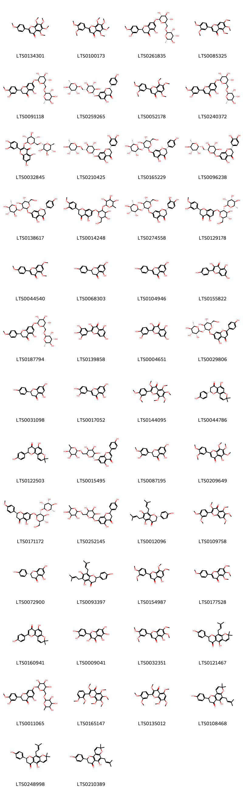 Cấu trúc hóa học của các hoạt chất thuộc nhóm Flavonoids là tangeretin (LTS0134301), nobiletin (LTS0100173), hesperidin (LTS0261835), sinensetin (LTS0085325), (2s)-5-hydroxy-2-(3-hydroxy-4-methoxyphenyl)-7-{[(2s,3r,4s,5s,6r)-3,4,5-trihydroxy-6-({[(2r,3r,4s,5r,6s)-3,4,5-trihydroxy-6-methyloxan-2-yl]oxy}methyl)oxan-2-yl]oxy}-2,3-dihydro-1-benzopyran-4-one (LTS0091118), narirutin (LTS0259265), isosinensetin (LTS0052178), diosmin (LTS0240372), 3-rutinosyl quercetin (LTS0032845), eriocitrin (LTS0210425), naringin (LTS0165229), (2s)-2-(3,4-dihydroxyphenyl)-5-hydroxy-7-{[(3r,4s,5s,6r)-3,4,5-trihydroxy-6-({[(2s,3r,4r,5r,6s)-3,4,5-trihydroxy-6-methyloxan-2-yl]oxy}methyl)oxan-2-yl]oxy}-2,3-dihydro-1-benzopyran-4-one (LTS0096238), (2s)-7-{[(2s,3s,4s,5s,6r)-4,5-dihydroxy-6-(hydroxymethyl)-3-{[(2s,3s,4r,5r,6s)-3,4,5-trihydroxy-6-methyloxan-2-yl]oxy}oxan-2-yl]oxy}-5-hydroxy-2-(4-hydroxyphenyl)-2,3-dihydro-1-benzopyran-4-one (LTS0138617), 7-{[4,5-dihydroxy-6-(hydroxymethyl)-3-{[(2s)-3,4,5-trihydroxy-6-methyloxan-2-yl]oxy}oxan-2-yl]oxy}-5-hydroxy-2-(3-hydroxy-4-methoxyphenyl)-2,3-dihydro-1-benzopyran-4-one (LTS0014248), neoeriocitrin (LTS0274558), neohesperidin (LTS0129178), apigenin trimethyl ether (LTS0044540), asahina (LTS0068303), chamomile (LTS0104946), kaempherol (LTS0155822), (2s)-5-hydroxy-2-(4-methoxyphenyl)-7-{[(2s,3r,4s,5s,6r)-3,4,5-trihydroxy-6-({[(2r,3r,4r,5r,6s)-3,4,5-trihydroxy-6-methyloxan-2-yl]oxy}methyl)oxan-2-yl]oxy}-2,3-dihydro-1-benzopyran-4-one (LTS0187794), myricetin (LTS0139858), quercetin (LTS0004651), rhoifolin (LTS0029806), naringenin (LTS0031098), luteolin (LTS0017052), 3-methoxynobiletin (LTS0144095), (2s)-5-hydroxy-2-(4-hydroxyphenyl)-8,8-dimethyl-2h,3h-pyrano[2,3-f]chromen-4-one (LTS0044786), citflavanone (LTS0122503), 5-hydroxy-2-(4-hydroxyphenyl)-7-{[(2s,5s)-3,4,5-trihydroxy-6-({[(2r,5r)-3,4,5-trihydroxy-6-methyloxan-2-yl]oxy}methyl)oxan-2-yl]oxy}chromen-4-one (LTS0015495), hesperetin (LTS0087195), demethylnobiletin (LTS0209649), poncirin (LTS0171172), 5-hydroxy-2-(4-hydroxyphenyl)-7-[(3,4,5-trihydroxy-6-{[(3,4,5-trihydroxy-6-methyloxan-2-yl)oxy]methyl}oxan-2-yl)oxy]-2,3-dihydro-1-benzopyran-4-one (LTS0252145), lonchocarpol a (LTS0012096), hexamethylquercetagetin (LTS0109758), (-)-naringenin (LTS0072900), 5,7-dihydroxy-2-(4-hydroxyphenyl)-6,8-bis(3-methylbut-2-en-1-yl)-2,3-dihydro-1-benzopyran-4-one (LTS0093397), 2-(3,4-dimethoxyphenyl)-5-hydroxy-7,8-dimethoxychromen-4-one (LTS0154987), 4’,5,6,7-tetramethoxyflavone (LTS0177528), atalantoflavone (LTS0160941), quercetagetin (LTS0009041), 2-(3,4-dimethoxyphenyl)-5-hydroxy-6,7-dimethoxychromen-4-one (LTS0032351), lupinifolin (LTS0121467), hesperidin (LTS0011065), 2-(2,3-dimethoxyphenyl)-3,5,6,7,8-pentamethoxychromen-4-one (LTS0165147), gossypetin hexamethyl ether (LTS0135012), cajaflavanone (LTS0108468), (2s)-5-hydroxy-2-(4-hydroxyphenyl)-8,8-dimethyl-10-(3-methylbut-2-en-1-yl)-2h,3h-pyrano[3,2-g]chromen-4-one (LTS0248998), (2s)-5-hydroxy-2-(4-hydroxyphenyl)-8,8-dimethyl-6-(3-methylbut-2-en-1-yl)-2h,3h-pyrano[2,3-f]chromen-4-one (LTS0210389), phlorizin (LTS0198771), 8-{[4,5-dihydroxy-6-(hydroxymethyl)-3-[(3,4,5-trihydroxyoxan-2-yl)oxy]oxan-2-yl]oxy}-5,7-dihydroxy-2-(4-hydroxyphenyl)chromen-4-one (LTS0125263), 3,5-dihydroxy-2-(4-methoxyphenyl)-7-[(3,4,5-trihydroxy-6-methyloxan-2-yl)oxy]-2,3-dihydro-1-benzopyran-4-one (LTS0207880), 2-(3,4-dimethoxyphenyl)-5,6,7,8-tetramethoxy-3-{[(2s,3r,4s,5s,6r)-3,4,5-trihydroxy-6-(hydroxymethyl)oxan-2-yl]oxy}chromen-4-one (LTS0074567), 3-{[(2s,3r,4r,5s,6r)-6-{[(2-carboxyacetyl)oxy]methyl}-3,4,5-trihydroxyoxan-2-yl]oxy}-2-(3,4-dihydroxyphenyl)-5,7-dihydroxy-1λ⁴-chromen-1-ylium (LTS0186341), 3-{[(2s,3r,4s,5s,6r)-6-{[(2-carboxyacetyl)oxy]methyl}-3,4,5-trihydroxyoxan-2-yl]oxy}-2-(3,4-dihydroxyphenyl)-5,7-dihydroxy-1λ⁴-chromen-1-ylium (LTS0142659), chrysin (LTS0200644), naringine (LTS0138800), (2s,3r)-3,5-dihydroxy-2-(4-methoxyphenyl)-7-{[(2r,3r,4r,5r,6s)-3,4,5-trihydroxy-6-methyloxan-2-yl]oxy}-2,3-dihydro-1-benzopyran-4-one (LTS0151486), 5,7-dihydroxy-2-(3-hydroxy-4-methoxyphenyl)-3,8-bis({[3,4,5-trihydroxy-6-(hydroxymethyl)oxan-2-yl]oxy})chromen-4-one (LTS0086798), 2-(3,4-dimethoxyphenyl)-5,6,7,8-tetramethoxy-3-{[3,4,5-trihydroxy-6-(hydroxymethyl)oxan-2-yl]oxy}chromen-4-one (LTS0245642), 8-{[(2s,3r,4s,5s,6r)-4,5-dihydroxy-6-(hydroxymethyl)-3-{[(2s,3r,4s,5r)-3,4,5-trihydroxyoxan-2-yl]oxy}oxan-2-yl]oxy}-5,7-dihydroxy-2-(4-hydroxyphenyl)chromen-4-one (LTS0255490), cyanidin 3-glucoside (LTS0217835), (2s,3r)-5-hydroxy-2-(4-hydroxy-3-methoxyphenyl)-7-methoxy-3-{[(2s,3r,4s,5s,6r)-3,4,5-trihydroxy-6-(hydroxymethyl)oxan-2-yl]oxy}-2,3-dihydro-1-benzopyran-4-one (LTS0267597), galangin (LTS0210648), 2-(3,4-dimethoxyphenyl)-6,7,8-trimethoxychromen-4-one (LTS0266569), 5,7-dihydroxy-2-(4-hydroxyphenyl)-3,8-bis({[(2s,3r,4s,5s,6r)-3,4,5-trihydroxy-6-(hydroxymethyl)oxan-2-yl]oxy})chromen-4-one (LTS0226544), 2-(3,4-dimethoxyphenyl)-5-hydroxy-3,6,7,8-tetramethoxychromen-4-one (LTS0235026), 5-hydroxy-2-(4-methoxyphenyl)-7-[(3,4,5-trihydroxy-6-{[(3,4,5-trihydroxy-6-methyloxan-2-yl)oxy]methyl}oxan-2-yl)oxy]-2,3-dihydro-1-benzopyran-4-one (LTS0053955), 5,7-dihydroxy-2-(4-hydroxyphenyl)-3,8-bis({[3,4,5-trihydroxy-6-(hydroxymethyl)oxan-2-yl]oxy})chromen-4-one (LTS0032795), 5,7-dihydroxy-2-(3-hydroxy-4-methoxyphenyl)-8-{[(2r,3r,4s,5s,6r)-3,4,5-trihydroxy-6-(hydroxymethyl)oxan-2-yl]oxy}-3-{[(2s,3r,4s,5s,6r)-3,4,5-trihydroxy-6-(hydroxymethyl)oxan-2-yl]oxy}chromen-4-one (LTS0210064), scutellarein (LTS0136843).