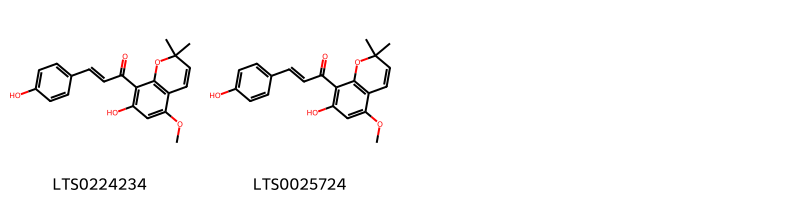 Cấu trúc hóa học của các hoạt chất thuộc nhóm Linear 1,3-diarylpropanoids là 1-(7-hydroxy-5-methoxy-2,2-dimethylchromen-8-yl)-3-(4-hydroxyphenyl)prop-2-en-1-one (LTS0224234), citrunobin (LTS0025724).