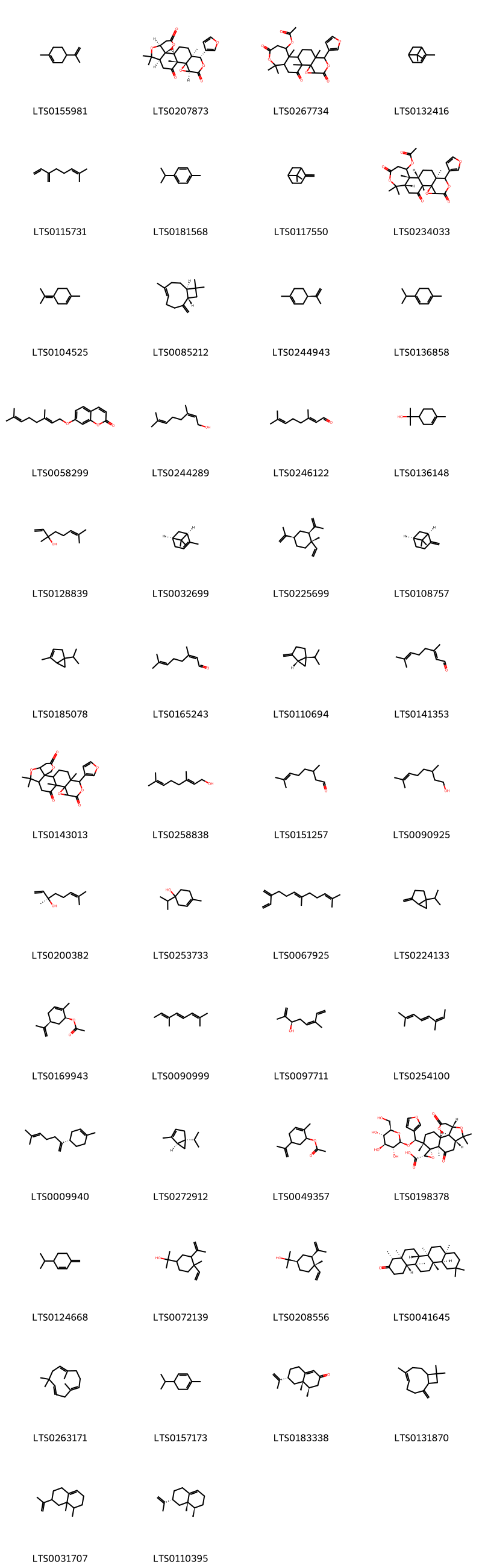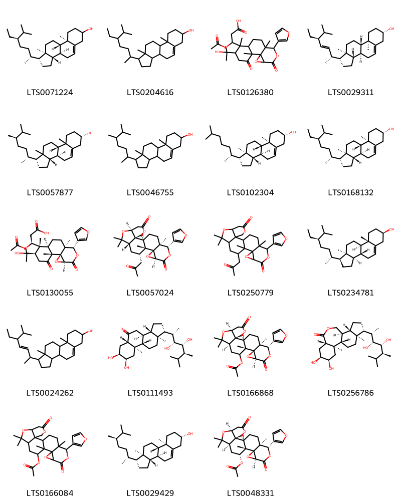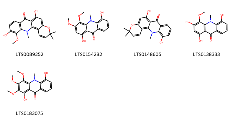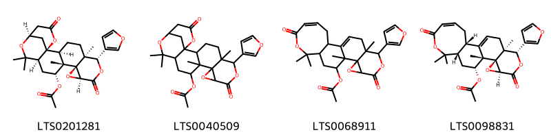 Cấu trúc hóa học của các hoạt chất thuộc nhóm Naphthopyrans là (1s,2s,5s,6s,9s,11r,12s,13r,15s,18r)-6-(furan-3-yl)-5,12,16,16-tetramethyl-8,20-dioxo-7,10,17,21-tetraoxahexacyclo[16.3.1.0¹,¹⁵.0²,¹².0⁵,¹¹.0⁹,¹¹]docosan-13-yl acetate (LTS0201281), 6-(furan-3-yl)-5,12,16,16-tetramethyl-8,20-dioxo-7,10,17,21-tetraoxahexacyclo[16.3.1.0¹,¹⁵.0²,¹².0⁵,¹¹.0⁹,¹¹]docosan-13-yl acetate (LTS0040509), 18-(furan-3-yl)-8,8,12,19-tetramethyl-6,16-dioxo-7,14,17-trioxapentacyclo[10.9.0.0²,⁹.0¹³,¹⁵.0¹³,¹⁹]henicosa-1(21),4-dien-11-yl acetate (LTS0068911), (2s,4z,9s,11r,12s,13r,15s,18s,19s)-18-(furan-3-yl)-8,8,12,19-tetramethyl-6,16-dioxo-7,14,17-trioxapentacyclo[10.9.0.0²,⁹.0¹³,¹⁵.0¹³,¹⁹]henicosa-1(21),4-dien-11-yl acetate (LTS0098831).