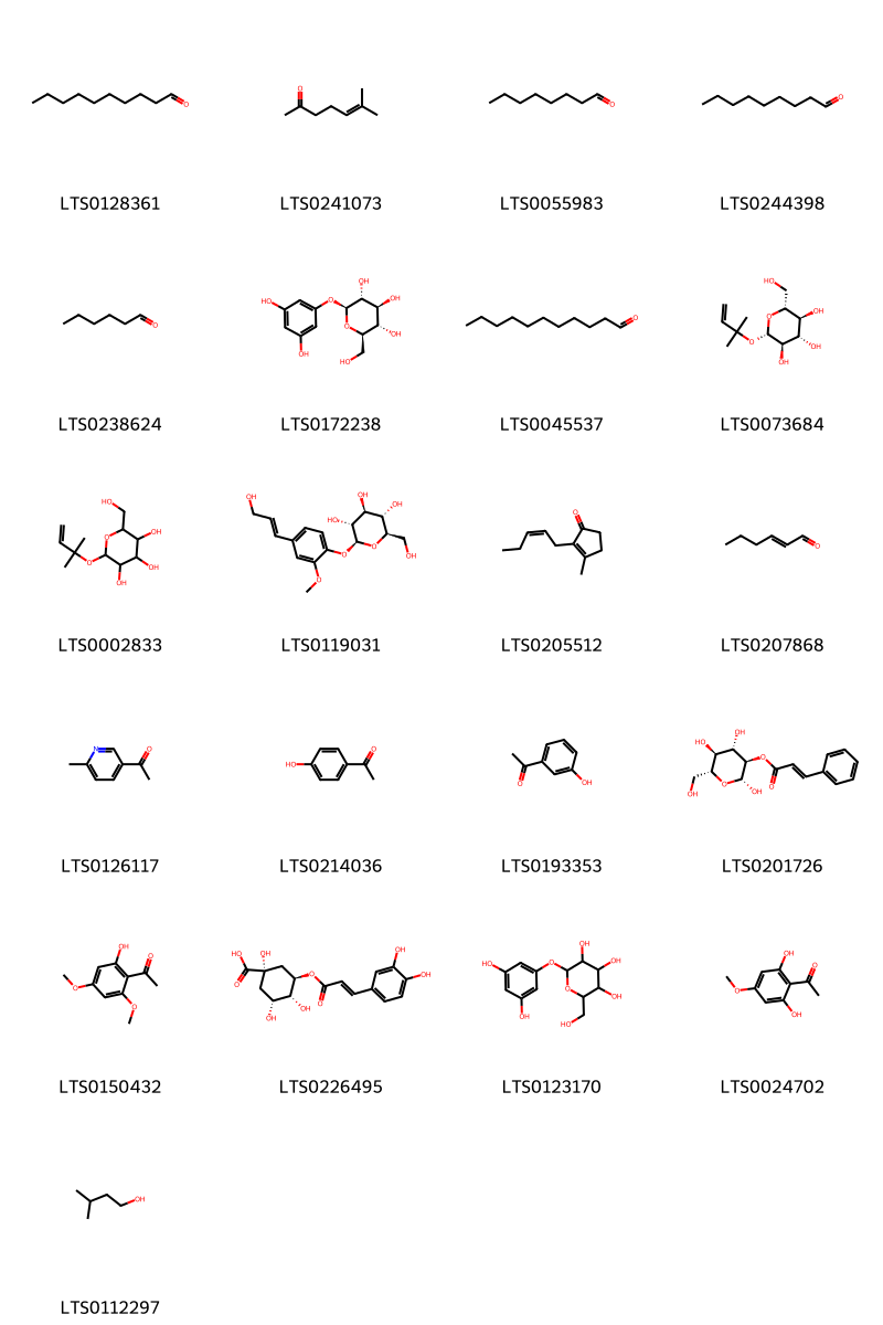 Cấu trúc hóa học của các hoạt chất thuộc nhóm Organooxygen compounds là decanal (LTS0128361), 6-methyl-5-hepten-2-one (LTS0241073), octanal (LTS0055983), nonanal (LTS0244398), hexanal (LTS0238624), (2s,3r,4s,5s,6r)-2-(3,5-dihydroxyphenoxy)-6-(hydroxymethyl)oxane-3,4,5-triol (LTS0172238), aldehyde c11 (LTS0045537), (2r,3s,4s,5r,6s)-2-(hydroxymethyl)-6-[(2-methylbut-3-en-2-yl)oxy]oxane-3,4,5-triol (LTS0073684), 2-(hydroxymethyl)-6-[(2-methylbut-3-en-2-yl)oxy]oxane-3,4,5-triol (LTS0002833), coniferin (LTS0119031), jasmone (LTS0205512), (e)-2-hexenal (LTS0207868), 3-acetyl-6-methylpyridine (LTS0126117), hydroxyacetophenone (LTS0214036), 3-hydroxyacetophenone (LTS0193353), (2r,3r,4s,5s,6r)-2,4,5-trihydroxy-6-(hydroxymethyl)oxan-3-yl (2e)-3-phenylprop-2-enoate (LTS0201726), xanthoxylin (LTS0150432), chlorogenic acid (LTS0226495), 2-(3,5-dihydroxyphenoxy)-6-(hydroxymethyl)oxane-3,4,5-triol (LTS0123170), phloretin (LTS0024702), isoamyl alcohol (LTS0112297).