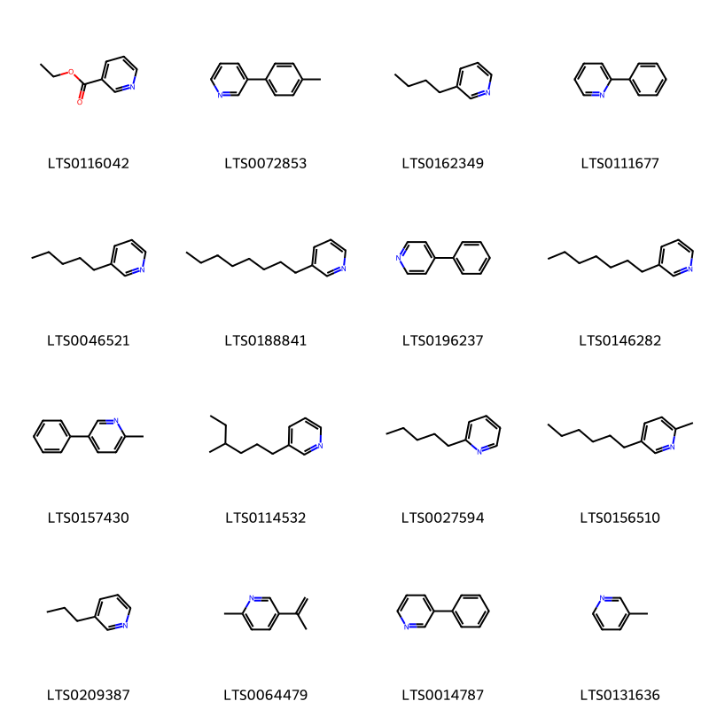 Cấu trúc hóa học của các hoạt chất thuộc nhóm Pyridines and derivatives là ethyl nicotinate (LTS0116042), 3-(4-methylphenyl)pyridine (LTS0072853), 3-butylpyridine (LTS0162349), 2-phenylpyridine (LTS0111677), 3-pentylpyridine (LTS0046521), 3-octylpyridine (LTS0188841), 4-phenylpyridine (LTS0196237), 3-heptylpyridine (LTS0146282), 2-methyl-5-phenylpyridine (LTS0157430), 3-(4-methylhexyl)pyridine (LTS0114532), 2-pentylpyridine (LTS0027594), 5-hexyl-2-methylpyridine (LTS0156510), 3-propylpyridine (LTS0209387), 2-methyl-5-isopropenylpyridine (LTS0064479), 3-phenylpyridine (LTS0014787), 3-methylpyridine (LTS0131636).